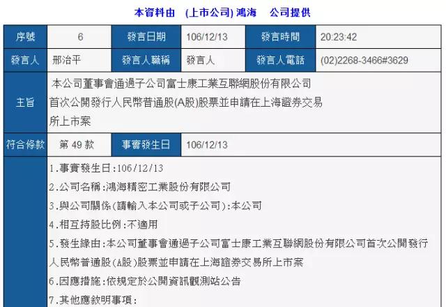 而在12月13日晚,據(jù)臺灣證交所公告,鴻海精密(2317.TW)董事會通過子公司富士康工業(yè)互聯(lián)網(wǎng)股份有限公司(Foxconn Industrial Internet Co., Ltd。)首次公開發(fā)行人民幣普通股股票,并申請在上海證券交易所上市提案。