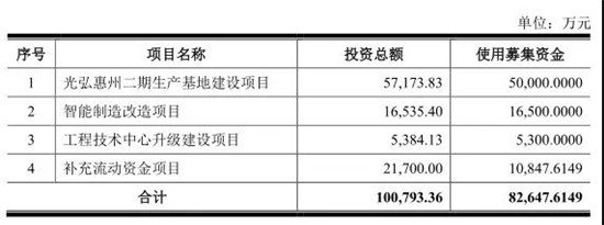 此次光弘科技發(fā)行人民幣普通股8868萬(wàn)股,每股發(fā)行價(jià)9.99元,募集資金8.86億元,募集資金凈額8.28億元將用于投資光弘惠州二期生產(chǎn)基地建設(shè)、智能制造改造、工程技術(shù)中心升級(jí)建設(shè)、補(bǔ)充流動(dòng)資金等項(xiàng)目。