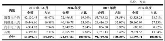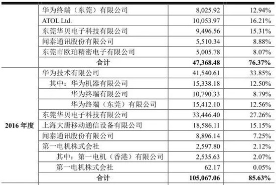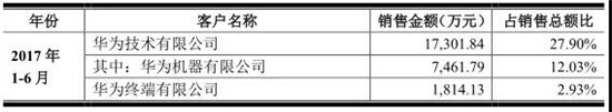 其中華為訂單占比較大,2014年-2017年上半年占比分別為16.50%、20.18%、29.09%和 24.55%!