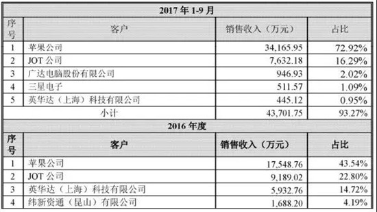 而從單一客戶來看的話,2014年-2017年1-9月,蘋果作為第一大客戶銷售收入占比分別達(dá)到了53.90%、76.74%、43.54%、72.82%,第二大客戶JOT公司在2016年-2017年1-9月所占別則分別達(dá)到了22.80%、16.29%!