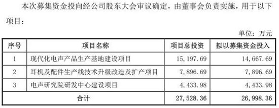 12月27日,據(jù)朝陽電子發(fā)布招股書表示,本次公開發(fā)行股票的數(shù)量不超過 2,400 萬股,不低于發(fā)行后總股本的25%。募集資金2.69億元,用于現(xiàn)代化電聲產(chǎn)品生產(chǎn)基地建設(shè)項(xiàng)目、耳機(jī)及配件生產(chǎn)線技術(shù)升級(jí)改造擴(kuò)產(chǎn)項(xiàng)目、電聲研究院研發(fā)中心建設(shè)項(xiàng)目!