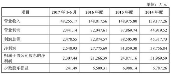 從營(yíng)收角度來看,其2014年-2017年上半年?duì)I收分別為8.12億元、7.51億元、11.95億元、5.93億元,凈利潤(rùn)分別為5803萬元、5647萬元、7451萬元、2546萬元,從凈利潤(rùn)來看,2017年與前一年相比出現(xiàn)了大幅度的下降!