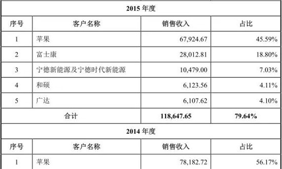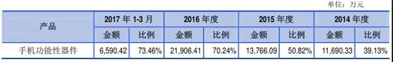 而從客戶群體來看的話,其最大的客戶為蘋果,且業(yè)績(jī)嚴(yán)重依賴于蘋果!2014年到2017年1-9月,公司應(yīng)用于蘋果公司終端品牌生產(chǎn)所實(shí)現(xiàn)的收入分別為3.46億、4.52億、3.65億、4.44億,占營(yíng)收比列分別為90.92%、92.57%、90.57%、94.75%!