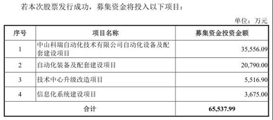 據(jù)披露,科瑞技術(shù)此次IPO擬募集6.55億元,其中,3.56億元用于中山科瑞自動(dòng)化技術(shù)有限公司自動(dòng)化設(shè)備及配套建設(shè)項(xiàng)目,2.08億元用于自動(dòng)化裝備及配套建設(shè)項(xiàng)目,5516.90萬元用于技術(shù)中心升級(jí)改造項(xiàng)目,其余用于信息化系統(tǒng)建設(shè)項(xiàng)目。