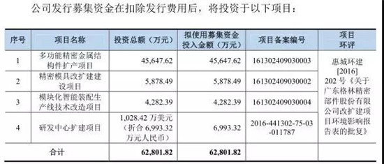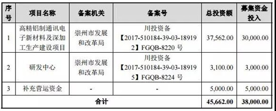 據(jù)招股書表示,此次總計(jì)募集資金3.8億,其中高精鋁制通訊電子新材料及深加工生產(chǎn)項(xiàng)目總投資3.7億元,研發(fā)中心投資0.31億元!