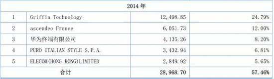 據(jù)杰美特招股書下顯示,杰美特提示了公司客戶相對(duì)集中的風(fēng)險(xiǎn)。報(bào)告期內(nèi),杰美特50%以上的收入來自于ODM/OEM業(yè)務(wù),客戶主要為智能終端配件行業(yè)的國際知名品牌商以及大型智能終端制造商,其中,前5名客戶的銷售額占公司當(dāng)年?duì)I業(yè)收入的比例分別為57.46%、46.76%、49.38%和50.62%。報(bào)告期內(nèi),杰美特外銷收入占比分別為74.32%、42.97%、48.55%、54.76%。但是單一大客戶華為占比非常高,從2015年到2017年上半年,占比分別為20.15%、17.00%、23.07%!