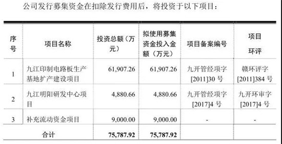 招股書顯示,明陽電路本次IPO計(jì)劃募集資金7.58億元,其中6.19億元用于九江印制電路板生產(chǎn)基地?cái)U(kuò)產(chǎn)建設(shè)項(xiàng)目,占募資總額比例超八成;此外,9000萬元補(bǔ)充流動(dòng)資金項(xiàng)目,其余的4880.66萬元用于九江明陽研發(fā)中心項(xiàng)目。