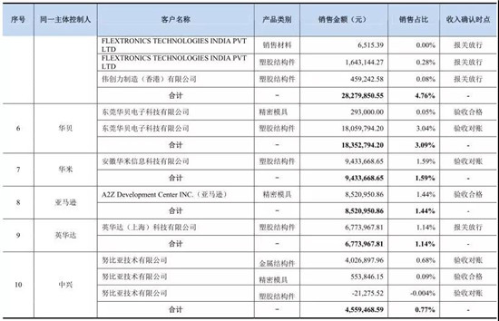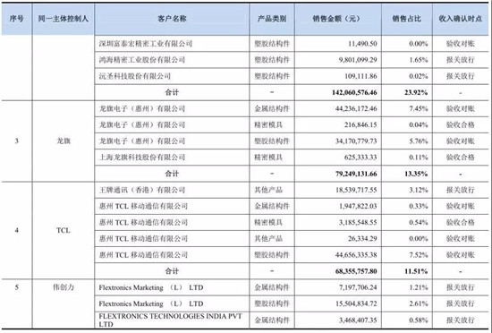 公司直接客戶包括富士康、和碩、廣達(dá)、仁寶、立訊精密、淳華、嘉聯(lián)益、莫仕、信維通信、瑞聲科技、歌爾股份等知名消費(fèi)電子產(chǎn)品制造服務(wù)商及組件生產(chǎn)商。值得一提的是,按受同一實(shí)際控制人控制的客戶合并計(jì)算,恒銘達(dá)前五大客戶的合計(jì)銷售收入占營(yíng)業(yè)收入的比重分別為84.17%、65.13%、68.16%和74.08%,其中,公司對(duì)富士康的銷售收入占營(yíng)業(yè)收入的比重分別為0%、18.78%、42.77%、47.37%,客戶集中度較高。