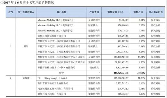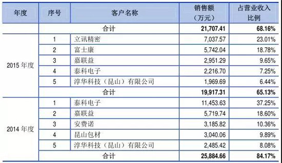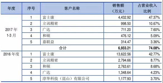2014年至今年上半年,格林精密向前十大客戶銷售的收入分別為6.78億元、7.14億元、11.23億元、5.87億元,分別占公司當(dāng)期營(yíng)業(yè)收入的80.29%、95.08%、93.98%、97.25%。由此可見,報(bào)告期,前十大客戶貢獻(xiàn)的營(yíng)業(yè)收入占公司營(yíng)業(yè)收入的比重超過80%。以2017年上半年為例,聯(lián)想在其營(yíng)收占比達(dá)到了35.68%,富智康在其贏輸占比達(dá)到了23.92%,這兩家公司合計(jì)占比超過了60%!第三名的龍旗在其營(yíng)收中占比也達(dá)到了13.35%!