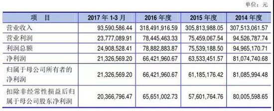 從營(yíng)收角度來看的話,2014-2016年及2017年1-3月份,恒銘達(dá)實(shí)現(xiàn)營(yíng)業(yè)收入3.08億元、3.06億元、3.18億元和9350.06萬元,同期凈利潤(rùn)為8107.74萬元、6353.35萬元、6642.19萬元和2132.66萬元。