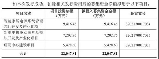 據(jù)招股書顯示,本次公開發(fā)行不超過 2570.00 萬股,占發(fā)行后總股本 25%。本次募集資金擬投資于智能家居電源系統(tǒng)管理芯片開發(fā)及產(chǎn)業(yè)化項(xiàng)目、新型電機(jī)驅(qū)動(dòng)芯片及模塊開發(fā)及產(chǎn)業(yè)化項(xiàng)目、研發(fā)中心建設(shè)項(xiàng)目,投資總額分別為9416.46 萬元、7202.76 萬元和 5428.60 萬元。