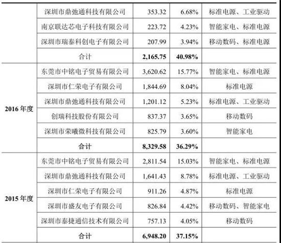 而從芯朋微電子客戶群體來看的話,公司報(bào)告期向前五名主要客戶的銷售額占當(dāng)期營(yíng)業(yè)收入的百分比分別為43.57%、37.15%、36.29%和 40.98%。據(jù)其表示,公司報(bào)告期前五大客戶具有一定的穩(wěn)定性,占比較低,不存在銷售額占比過大的單一客戶。