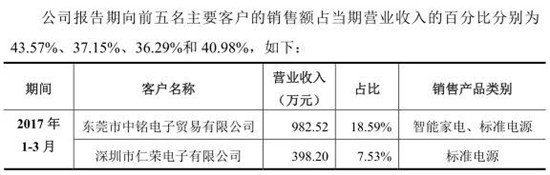 從明陽電路客戶群體來看,2014年-2017年上半年,其前五大客戶占營(yíng)收比例分別為37.96%、38.04%、42.48%、40.89%!2015年到2017年最大的客戶為偉創(chuàng)力,占比分別為12.34%、15.34%、15.77%!
