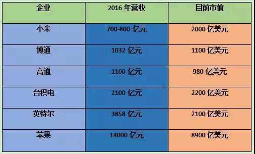 再如臺積電2016年的營收為2100億左右,小米的營收為臺積電的1/3左右,英特爾2016年的營收為3858億元,比小米更是高出4倍以上,試問小米市值如何與臺積電、英特爾相匹敵?