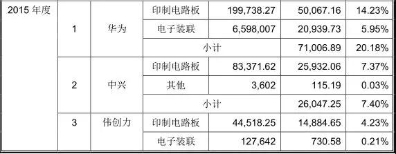 具體業(yè)務(wù)方面,其在2014年-2017年上半年,前兩大客戶均為華為以及中興!且主要產(chǎn)品為印制電路板和電子裝聯(lián)。這段時(shí)期內(nèi),公司向前五大客戶的銷售金額占主營業(yè)務(wù)收入的比重分別為44.48%、40.46%、47.35%和 40.82%,其中,對第一大客戶華為系的銷售金額增長較快,占比分別為 16.50%、20.18%、29.09%和 24.55%。