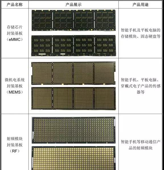 首先來看看深南電路在封裝載板市場的情況!據(jù)了解,深南電路生產(chǎn)的封裝基板產(chǎn)品大致分為五類,分別為存儲芯片封裝基板、微機(jī)電系統(tǒng)封裝基板、射頻模塊封裝基板、處理器芯片封裝基板和高速通信封裝基板等,主要應(yīng)用于移動(dòng)智能終端、服務(wù)/存儲。