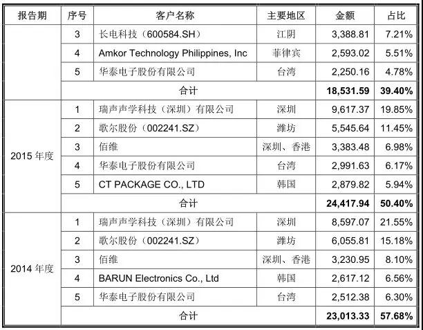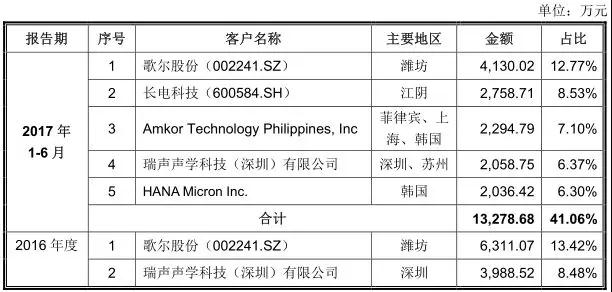 2017 年1-6 月,歌爾股份(002241.SZ)進(jìn)入公司內(nèi)銷前五大客戶,主要原因在于歌爾股份取得其終端客戶的訂單份額大幅增加,由此加大對公司的采購。此外,HANA Micron Inc.進(jìn)入公司封裝基板產(chǎn)品的前五大客戶,主要原因系其在中國大陸手機(jī)指紋器件市場的份額大幅提升,因此增加對公司相關(guān)產(chǎn)品的采購。