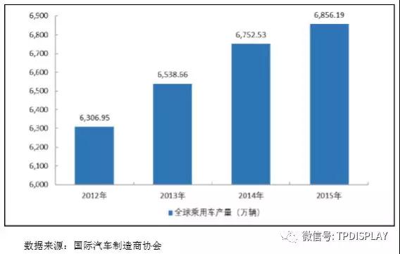 車(chē)載觸控產(chǎn)品的使用目前只占整個(gè)集成觸控模組和觸摸屏市場(chǎng)的一小部分,但是中小型轎車(chē)搭載平板觸摸中控系統(tǒng)以及車(chē)載觸控GPS導(dǎo)航已成為主流趨勢(shì)。汽車(chē)產(chǎn)銷(xiāo)量的持續(xù)增加仍對(duì)集成觸控模組和觸摸屏生產(chǎn)廠商帶來(lái)有利影響。根據(jù)國(guó)際汽車(chē)制造商協(xié)會(huì)的數(shù)據(jù)顯示,全球乘用車(chē)產(chǎn)量在2012年-2015年連續(xù)穩(wěn)定增長(zhǎng),2015年產(chǎn)量超過(guò)6,856萬(wàn)輛6。隨著人們對(duì)汽車(chē)內(nèi)飾舒適性、便捷性的需求提升,車(chē)載觸控產(chǎn)品的產(chǎn)業(yè)鏈規(guī)模將得到巨大擴(kuò)張。全球乘用車(chē)年產(chǎn)量情況如下圖所示: