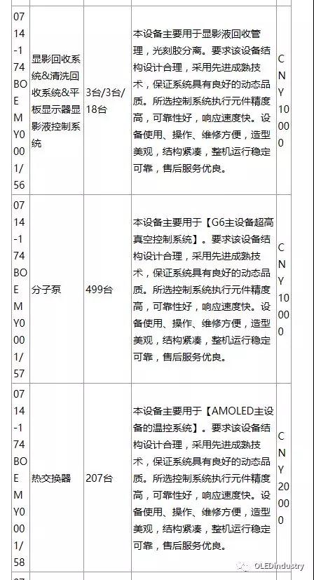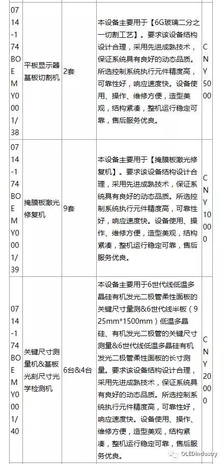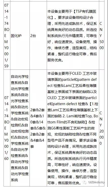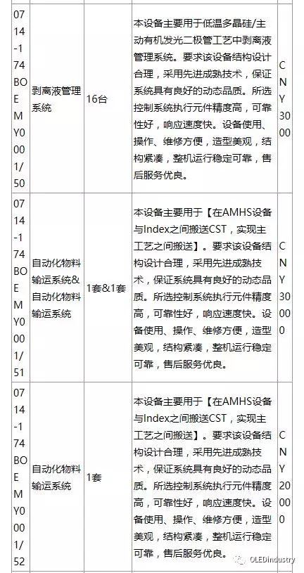 綿陽(yáng)京東方第6代AMOLED(柔性)生產(chǎn)線(xiàn)招標(biāo)產(chǎn)品列表(主要設(shè)備):