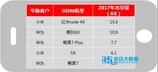 華勤2016年開始進入小米供應鏈,并在2017年研發(fā)了小米的幾款暢銷機型,確立了其在小米ODM供應商體系中地位。華勤2017年研發(fā)的小米暢銷機型包括紅米 note4X、小米5X等,這兩款機型的出貨分別為1560萬部和610萬部。同時,華勤亦給華為打造多款暢銷機型項目,包括暢玩6X、暢享7 plus和暢銷7等,這三款機型在2017年的出貨量分別是1090萬部、770萬部和600萬部。