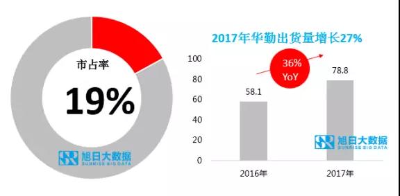 2017年,華勤手機ODM業(yè)務的增長與其“去單一大客戶化”的成功有著非常密切的關系。2017年華勤成功主導了多個小米的暢銷手機項目,在為小米重回出貨量巔峰立下汗馬功勞的同時,亦成功打破了華勤只有單一大客戶的市場魔咒,單一客戶比重偏大的風險明顯下降。根據(jù)旭日大數(shù)據(jù)的統(tǒng)計,2017年,華勤手機ODM出貨量約7880萬部,同比增長約36%,市場份額接近19%。