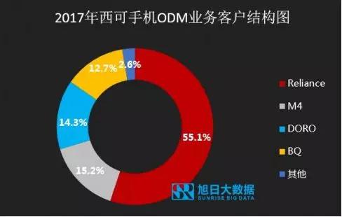 根據(jù)旭日大數(shù)據(jù)的統(tǒng)計,2017年,傳音是銳嘉科的最大客戶,出貨量約300萬部,占據(jù)銳嘉科手機ODM業(yè)務的占比約56%,其次,均為海外客戶。