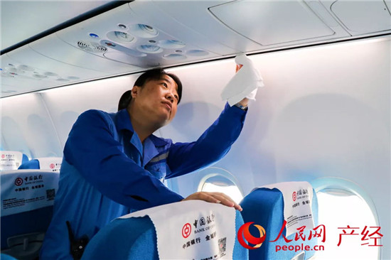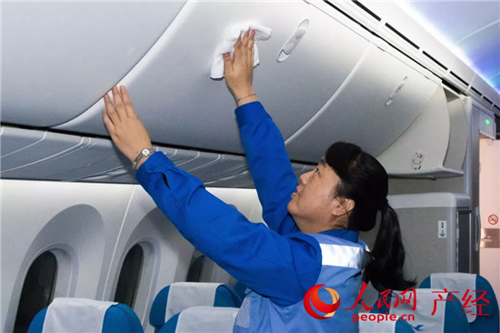 除了更換椅套之外,客艙保障員還要對客艙進行清潔打掃,如清潔廚房、擦拭小桌板、行李架、盥洗室、壁板及PMD配備等日常工作,并根據(jù)飛機的運行周期定期對客艙內(nèi)進行“深度清潔”,不放過任何縫隙,清潔無死角。