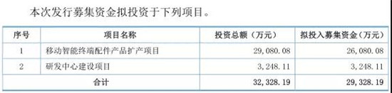 據(jù)招股書披露,此次公開發(fā)行股份不超過1000萬股,不低于25%!總計募集資金2.93億元,其中移動智能終端配件產(chǎn)品擴產(chǎn)項目投資2.90億元,研發(fā)中心建設(shè)項目投資.032億元!