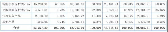 據(jù)其表示,智能手機保護類產(chǎn)品和平板電腦保護類產(chǎn)品為公司主要產(chǎn)品,2014年到2017年上半年,這兩種產(chǎn)品銷售收入分集分別為4.47億、3.65億、4.49億、1.98億,占當期主營業(yè)務(wù)營收的比例分別為93.43%、78.34%、83.23%、85.21%!