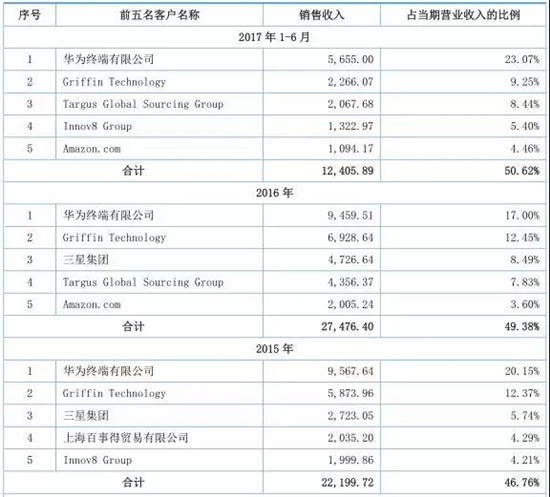 據(jù)杰美特招股書下顯示,杰美特提示了公司客戶相對集中的風險。報告期內(nèi),杰美特50%以上的收入來自于ODM/OEM業(yè)務(wù),客戶主要為智能終端配件行業(yè)的國際知名品牌商以及大型智能終端制造商,其中,前5名客戶的銷售額占公司當年營業(yè)收入的比例分別為57.46%、46.76%、49.38%和50.62%。報告期內(nèi),杰美特外銷收入占比分別為74.32%、42.97%、48.55%、54.76%。但是單一大客戶華為占比非常高,從2015年到2017年上半年,占比分別為20.15%、17.00%、23.07%!