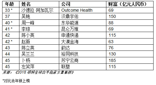 45歲或不到45歲的人數(shù)達(dá)10人,其中4位新面孔:芝加哥健康醫(yī)療科技公司Outcome Health的沙德拉·阿加瓦爾成為最年輕的上榜女富豪,年僅33歲;還有東華能源40歲的周一峰;昆侖萬維41歲的李瓊和大漠金海42歲的趙薇。