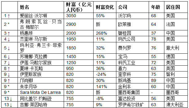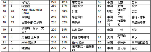碧桂園楊國強家族的楊美容憑借博實樂以財富115億元新上榜,博實樂已經(jīng)成為全球三大教育集團(tuán)之一。在中國也頗具知名度的時尚品牌Tory Burch的創(chuàng)始人以財富88億元新上榜,珠寶品牌潘多拉的丹麥聯(lián)合創(chuàng)始人溫妮·埃內(nèi)弗德森財富63億元。印度唯一一位上榜的白手起家女企業(yè)家KiranMazumdar-Shaw財富上漲88%,達(dá)到245億元。
