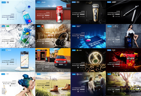 上周,vivo正式宣布vivo X21發(fā)布會日期之后,各領域潮牌就紛紛為vivo X21發(fā)布會打Call。其中有時尚高端領域的SWAROVSKI施華洛世奇,便捷生活的高德地圖、ofo小黃車及滴滴出行,還有QQ音樂、JBL、博朗、可口可樂、雪碧、多力多滋、FIJI_Water斐泉、Timberland、Qualcomm中國等16個品牌聯(lián)動應援。