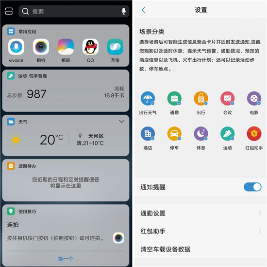 快應(yīng)用也不再僅僅是一個(gè)停留在人們口頭的虛擬生態(tài)。3月19日,vivo發(fā)布了新的一刻搭載人工智能的手機(jī)X21,就已經(jīng)引入了頭部快應(yīng)用。在X21負(fù)一屏,vivo整合了全局搜索、掃一掃、天氣、日程和第三方功能卡片,其中掃一掃支持支付寶二維碼、共享單車、商品條形碼等功能;負(fù)一屏還支持第三方的快應(yīng)用功能卡片,場景涉及火車票機(jī)票、酒店、出行路況、休息提醒、快遞提醒、電影票、出行目的地天氣提醒等。