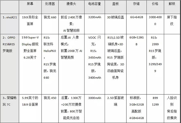 由此可見,即便2018年開年到現(xiàn)在,國內(nèi)市場手機出貨量仍然沒有緩過勁兒來,但是發(fā)布新機的數(shù)量卻在大幅度提升。對此,筆者統(tǒng)計了2018年以來,國產(chǎn)手機品牌主要10大新機的相關(guān)情況,以此來了解2018年第一季度,手機終端在帶動哪些流行趨勢。