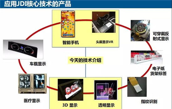 而在核心技術(shù)方面,JDI則圍繞智能手機(jī)、頭戴顯示VR、可穿戴反射式顯示、電子紙貨架標(biāo)簽、指紋識(shí)別、透明顯示、3D顯示、醫(yī)療顯示、車載顯示等眾多領(lǐng)域展開!