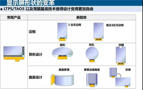 JDI使用LTPS能夠推出更多形狀的各種產(chǎn)品,對(duì)比常規(guī)產(chǎn)品來說,JDI的新趨勢(shì)有:1、邊框部分:三邊無邊框和四邊無邊框;由于LTPS的特性能夠使邊框越來越窄。2、異形設(shè)計(jì):例如車載用的圓形設(shè)計(jì),挖孔設(shè)計(jì)以及面向手機(jī)的凹槽設(shè)計(jì)。3、曲面設(shè)計(jì):有曲面屏幕、邊緣曲面以及可折疊性。這些均為L(zhǎng)TPS與玻璃基板、薄膜組合形成的設(shè)計(jì)。