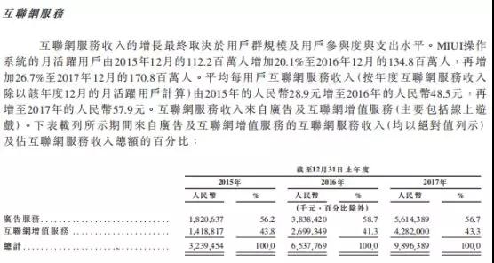 值得一提的是,小米在海外市場(chǎng)的增速非常強(qiáng)勁。招股書顯示,2015年、2016年、2017年,小米的海外市場(chǎng)收入分別為40.5億元、91.5億元、320.8億元,其中2017年海外市場(chǎng)收入更是同比暴漲了250%。在雷軍重視的互聯(lián)網(wǎng)領(lǐng)域,互聯(lián)網(wǎng)服務(wù)分部分別貢獻(xiàn)小米總收入的4.9%、9.6%及8.6%。目前小米主要從廣告服務(wù)及互聯(lián)網(wǎng)增值服務(wù)(主要包括游戲)賺取互聯(lián)網(wǎng)服務(wù)收入。