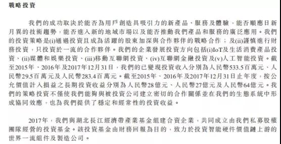 在戰(zhàn)略投資方面,其投資策略是:通過(guò)投資且成為活躍的股東加深與合作伙伴的戰(zhàn)略合作,以及謹(jǐn)慎進(jìn)行財(cái)務(wù)投資,擲骰子一流的合作伙伴,包括媒體和預(yù)覽投資、移動(dòng)互聯(lián)網(wǎng)投資、互聯(lián)網(wǎng)金融投資,企業(yè)投資方向包括IOT及生活消費(fèi)產(chǎn)品投資。已發(fā)行投資收入從2015年到2017年分別為533.5百萬(wàn)元、29.5百萬(wàn)元、283.4百萬(wàn)元!