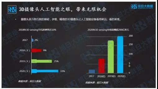 而攝像頭領(lǐng)域最新創(chuàng)新的進展莫過于3D攝像頭,3D攝像頭能夠?qū)崿F(xiàn)三維人臉識別、手勢識別與追蹤等等,幫助AI技術(shù)打開更大的應(yīng)用空間。李春麗透露去年3D攝像頭滲透率在2%左右。而由于國內(nèi)核心環(huán)節(jié)產(chǎn)業(yè)鏈缺失,國內(nèi)的研發(fā)進度不及預(yù)期。由此旭日大數(shù)據(jù)下調(diào)了今年3D攝像頭手機的滲透率預(yù)測。預(yù)計今年滲透率在9%左右,而到了19年國內(nèi)3D攝像頭產(chǎn)業(yè)鏈將會有全面的技術(shù)突破,全球滲透率將超過20%。