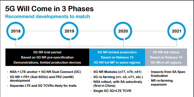 從2018年到2021年,5G無論是走獨(dú)立組網(wǎng)還是走非獨(dú)立組網(wǎng),從2018年開始所有國家運(yùn)營商都在做試商用,但真正到了2020年之后下半年或者2021年之后才開始大規(guī)模的商用。2020年到2021年就是真正的5G大規(guī)模商用,所有支持5G的獨(dú)立組網(wǎng)以及非獨(dú)立組網(wǎng)的終端網(wǎng)絡(luò)在2020年都會(huì)完成這個(gè)商用功能。
