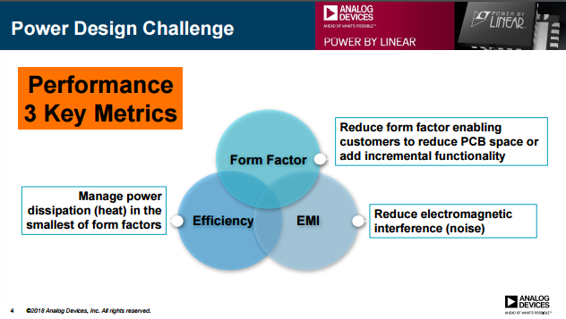自2017年3月收購Linear后,ADI在高性能模擬領(lǐng)域可謂從行業(yè)領(lǐng)先到一騎絕塵,ADI電源產(chǎn)品中國區(qū)市場(chǎng)總監(jiān)梁再信介紹了電源技術(shù)面臨的三大挑戰(zhàn):Form Factor、Efficiency、EMI,那ADI是如何設(shè)計(jì)、制造尺寸更小,效率更高以及更加抗干擾的電源產(chǎn)品的呢?