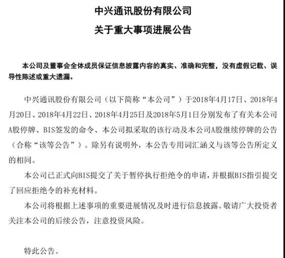 5月6日,中興再次發(fā)布公告表示,中興通訊股份有限公司于2018年4月17日、2018年4月20日、2018年4月22日、2018年4月25日及2018年5月1日分別發(fā)布了有關(guān)本公司A股停牌、BIS簽發(fā)的命令、本公司擬采取的該行動(dòng)及本公司A股繼續(xù)停牌的公告。除另有說(shuō)明外,本公告專(zhuān)用詞匯涵義與該等公告所定義的相同。本公司已正式向BIS提交了關(guān)于暫停執(zhí)行拒絕令的申請(qǐng),并根據(jù)BIS指引提交了回應(yīng)拒絕令的補(bǔ)充材料。