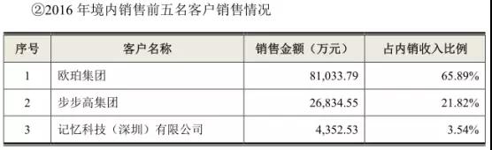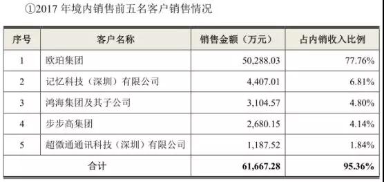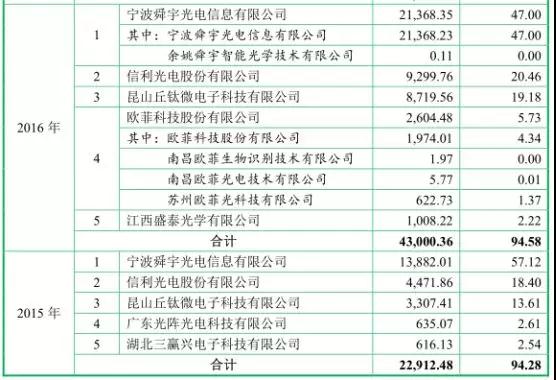 從客戶群體來看的話,2015-2017年,五方光電前五名客戶的銷售占比分別為94.28%、94.58%和91.44%。以2017年為例,五方光電的第一大客戶為歐菲科技股份有限公司,這一家大客戶帶來的收入占其營業(yè)收入的35%,而排名第二的寧波舜宇光電則占比30%(2015年占比57%,2016年占比47%)。