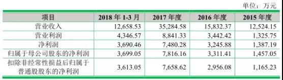 2015-2017年及2017年1-3月,宇晶機(jī)器分別實(shí)現(xiàn)營業(yè)收入1.25億元、1.58億元、3.53億元和1.27億元,同期凈利潤分別為1387.19萬元、3245.88萬元、7480.28萬元和3690.46萬元。