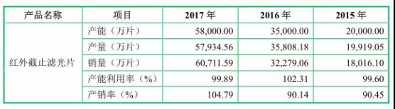 此外,從產(chǎn)能來看,其主要生產(chǎn)產(chǎn)品為紅外截止濾光片,從2015年到2017年,其產(chǎn)能增長幅度近3倍,銷量也提升了3倍多,2017年受益于雙攝像頭的爆發(fā),其產(chǎn)銷率也達(dá)到了104.79%!不過,2017年的產(chǎn)能利用率與2016年相比有所下降!