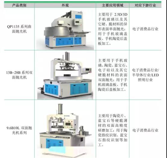 報(bào)告期內(nèi)公司的主要產(chǎn)品為具有精密數(shù)字控制系統(tǒng)的多線切割機(jī)和研磨拋光機(jī),產(chǎn)品主要用于玻璃、藍(lán)寶石、硅材料、磁性材料和陶瓷材料等硬脆材料的去除加工,覆蓋切割、研磨、拋光、鉆孔等加工工序,上述加工后的硬脆材料是生產(chǎn)消費(fèi)電子產(chǎn)品、LED產(chǎn)品、太陽能光伏設(shè)備、航空航天設(shè)備以及集成電路工業(yè)主要或關(guān)鍵元器件的基本材料。