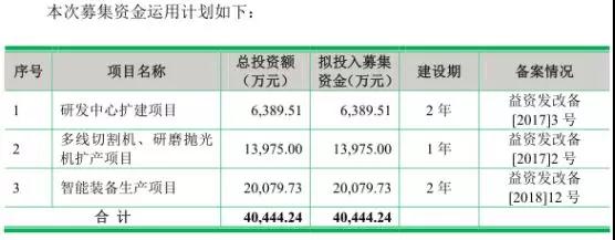 此次其計(jì)劃募集資金4.04億元,其中智能裝備生產(chǎn)項(xiàng)目占2.00億元,多線切割機(jī)、研磨拋光機(jī)擴(kuò)產(chǎn)項(xiàng)目占1.39億元,剩下的0.63億元用于研發(fā)中心擴(kuò)建項(xiàng)目!
