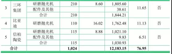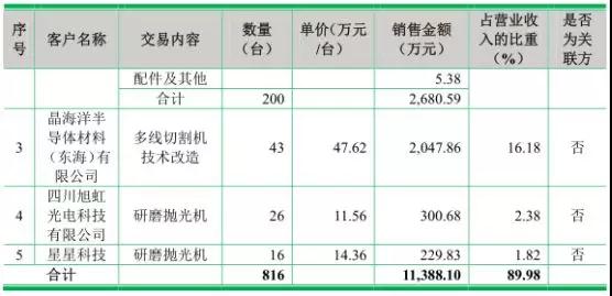 2015年以來,公司開發(fā)的新客戶歐菲光、比亞迪、三環(huán)集團(tuán)陸續(xù)產(chǎn)生銷售收入,成為公司的前五大客戶,使得公司對藍(lán)思科技銷售收入占公司銷售收入的比重下降至不到50%。據(jù)了解,宇晶機(jī)器報(bào)告期內(nèi)藍(lán)思科技銷售收入分別為5318.76 萬元、5213.46 萬元、16499.95萬元及6129.14 萬元,占公司銷售收入比例分別為42.47%、32.93%、46.76%及48.42%。