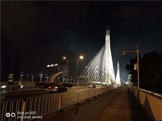 面對夜間較弱的光線以及復(fù)雜的光源,vivo X21i再次發(fā)揮出了F1.8的大光圈的優(yōu)勢,獲取了更多的進(jìn)光量,同時(shí)得益于AI智慧場景的智能優(yōu)化,即使在光線條件極差的橋底下,vivo X21i依舊拍出了江面波光凌凌的質(zhì)感細(xì)節(jié)。